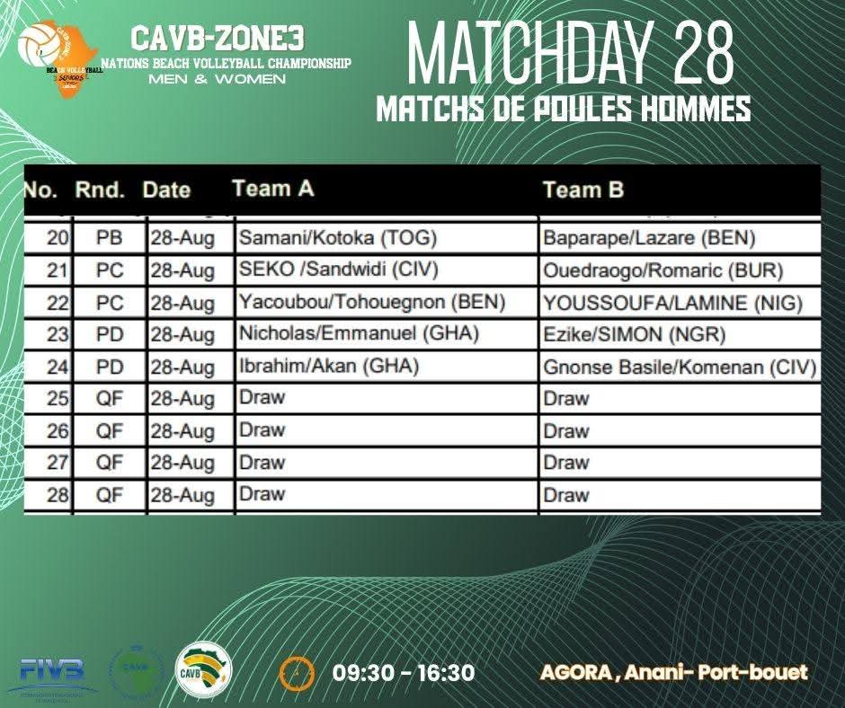 L’équipe nationale de beach volleyball du Togo, engagée dans la Coupe des Nations de la Zone 3 organisée par la Confédération Africaine de Volleyball (CAVB), a lancé sa campagne ce mercredi 27 août à Abidjan. Opposée successivement au Ghana et au Nigeria pour la 1ère journée de la phase de groupes, la paire togolaise composée de Bruno Kotoka et Achile Samani a connu un départ compliqué avec deux défaites en deux matchs.