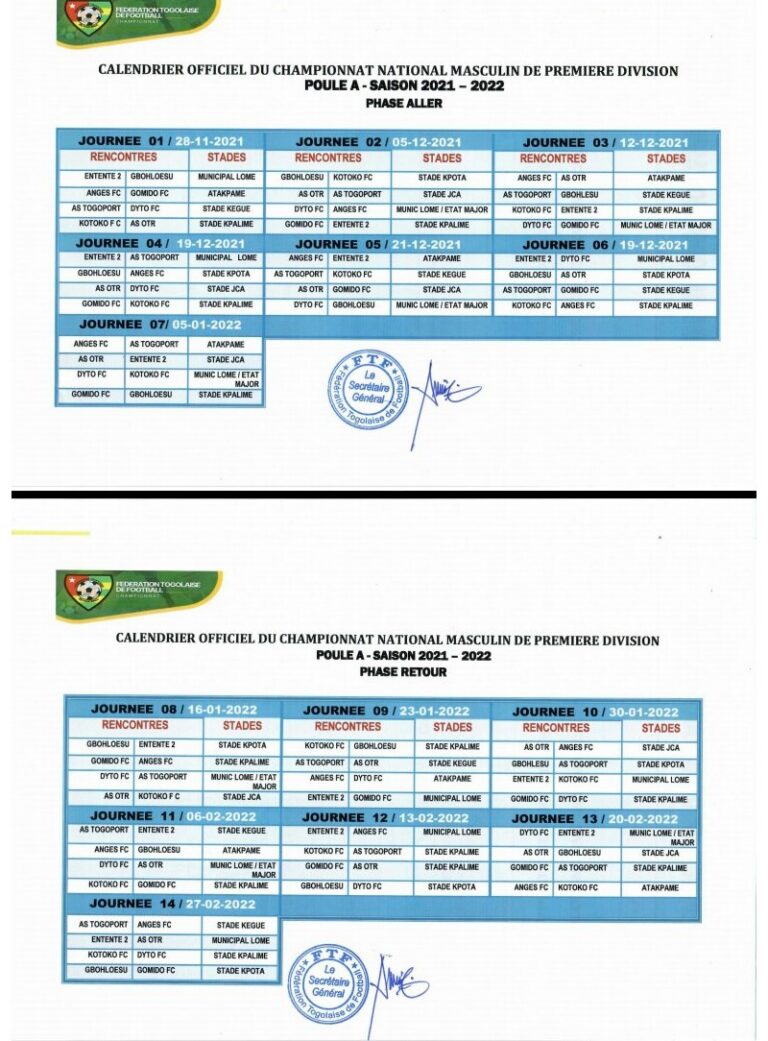 Championnat National de D1: Calendrier Poule A (Aller et Retour)