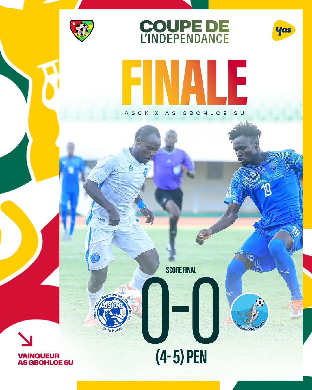 L’AS Gbohloe-Su a inscrit son nom au palmarès de la Coupe de l’Indépendance au terme d’une finale haletante face à l’ASCK. Après un match fermé conclu sur un score nul et vierge (0-0) dans le temps réglementaire, les Requins Mâles ont fait la différence lors de la séance des tirs au but, s’imposant 5-4.