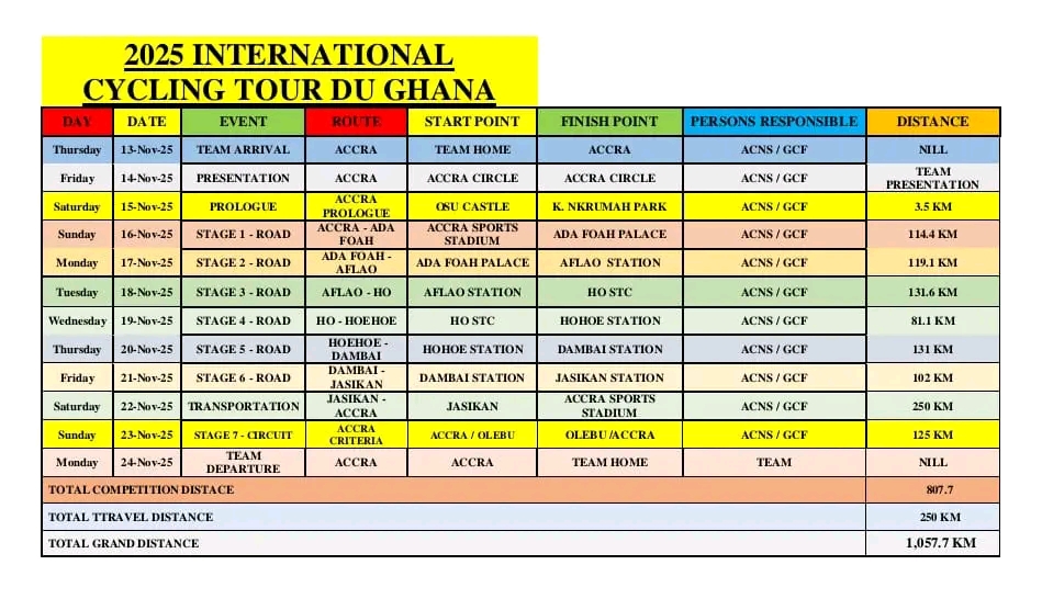 Le Tour du Ghana 2025 s’étendra sur 1 057,7 km répartis en 10 étapes, avec une distance de transbordement de 250 km. Les cyclistes traverseront les régions du Greater Accra, de la Volta, d’Oti et de l’Eastern Region. Un tracé qui mettra en valeur la diversité du relief, des cultures locales et du potentiel touristique du pays hôte.