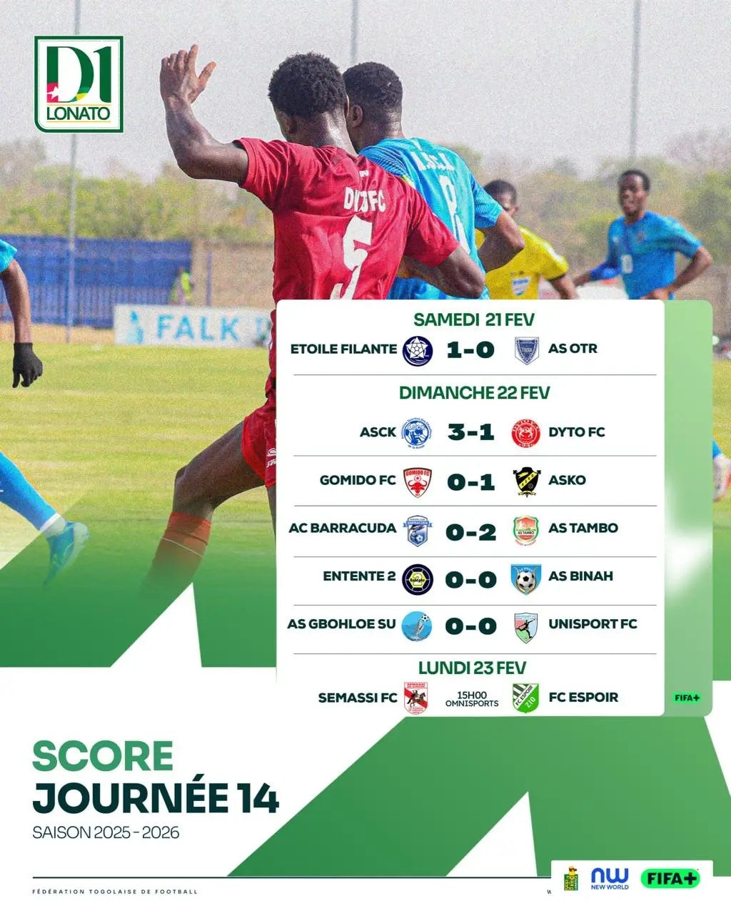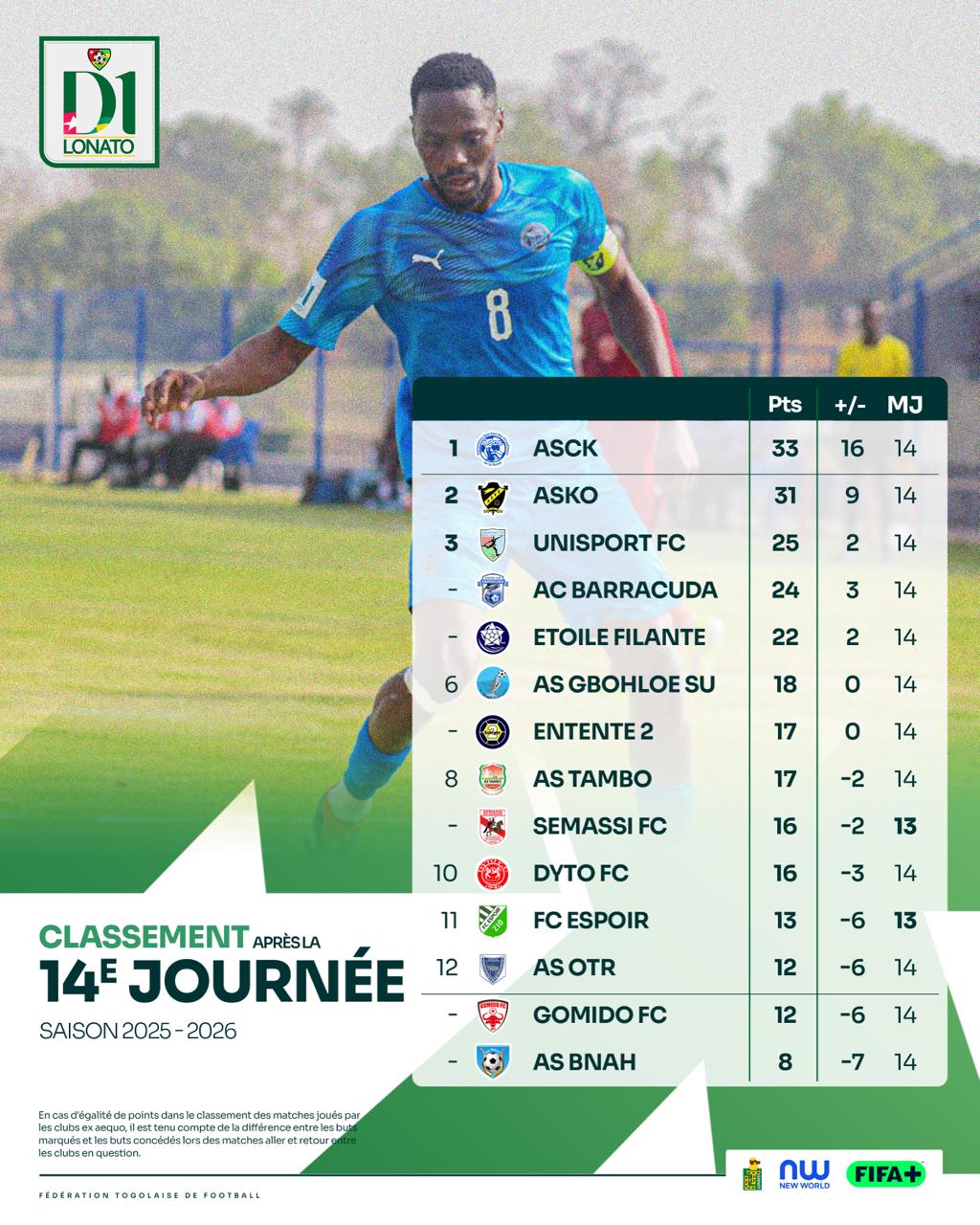 Après 14 journées, l’ASCK (33 pts) conserve la tête devant ASKO (31 pts). Unisport FC complète le podium avec 25 points. Derrière, la bataille pour les places d’honneur reste ouverte, tandis qu’en bas de tableau, AS Binah (8 pts) demeure lanterne rouge et voit la pression s’intensifier.