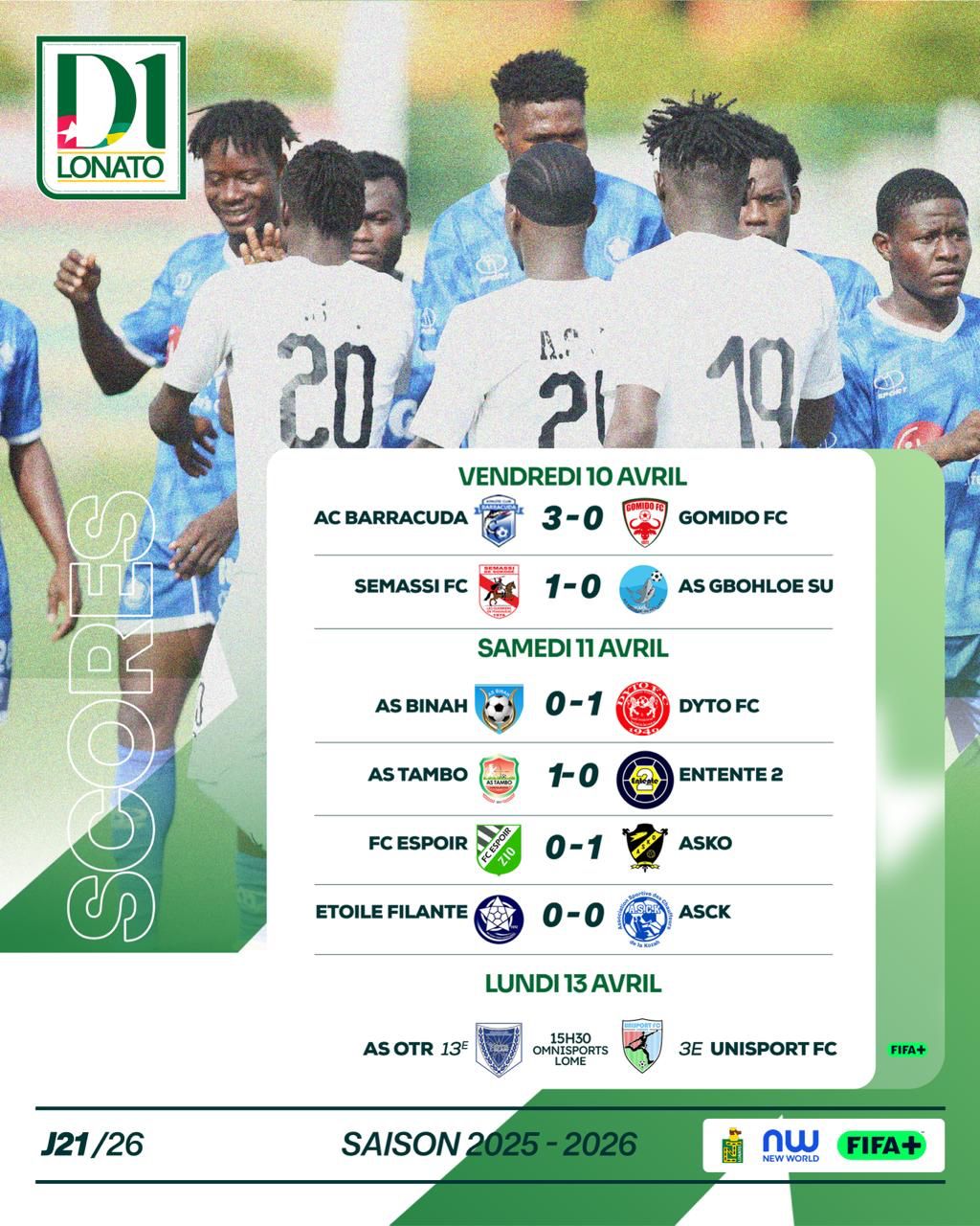 De son côté, l’AS Gbohloe-Su s’incline en déplacement sur le score de 1-0 face à Semassi, malgré un penalty arrêté par son gardien Tondoro Cissé. Chakour Touré a inscrit l’unique but de la rencontre à la 70e minute.