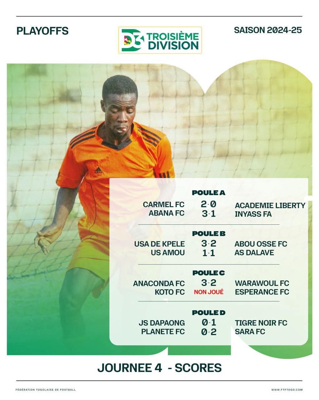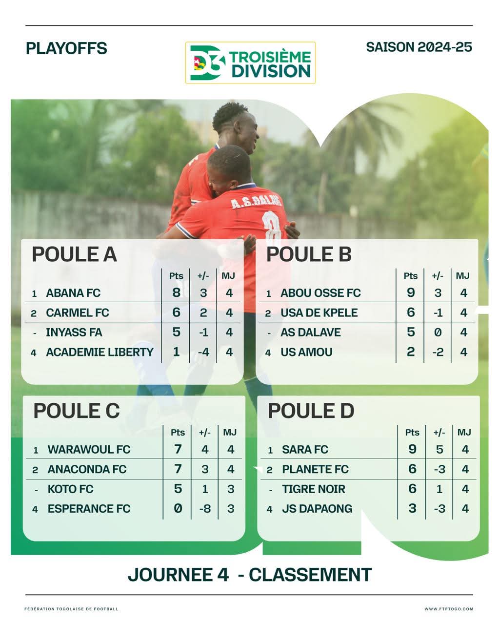 La quatrième journée des playoffs du championnat de Troisième Division togolaise (saison 2024-2025) a été marquée par des rencontres disputées et des confirmations en tête de certaines poules. À deux journées de la fin de cette phase décisive, la course pour les premières places reste ouverte dans la plupart des groupes.