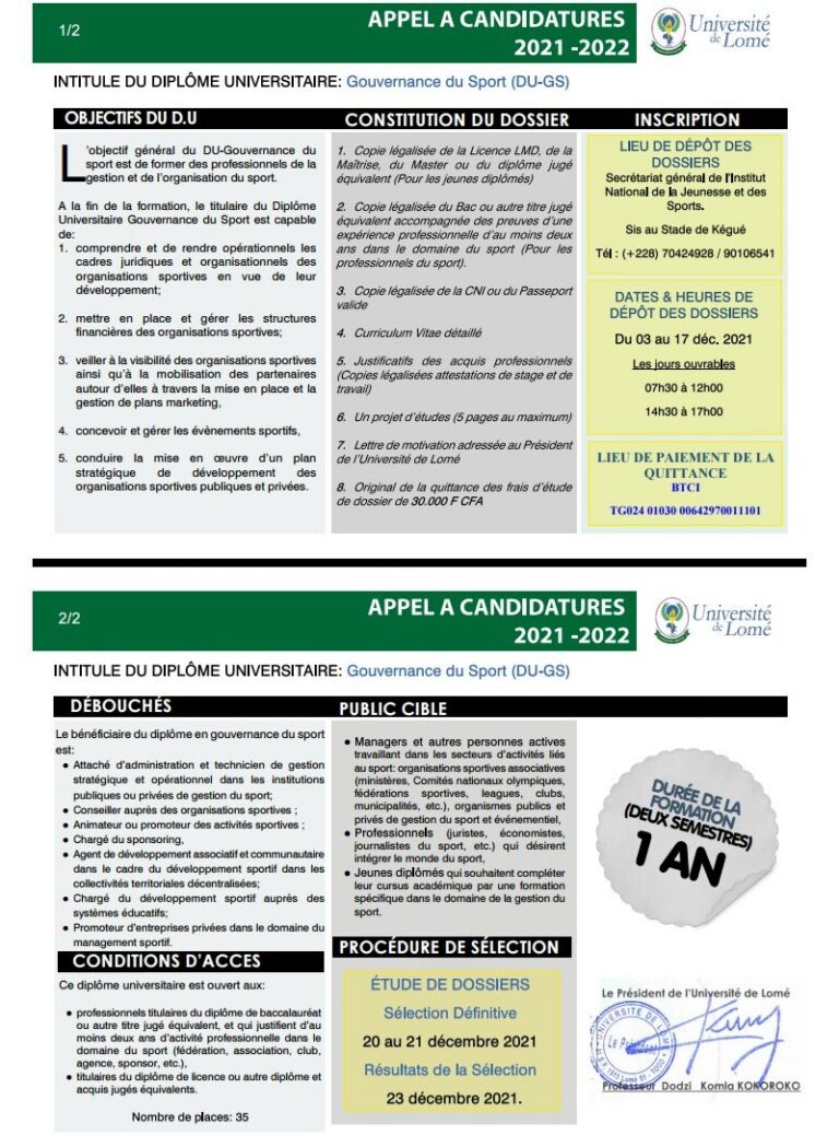 C’est ce que l’on peut constater. En effet, l’Université de Lomé vient de lancer un appel à candidature pour des personnes intéressées par un Diplôme universitaire de Gouvernance du Sport (DU-GS). Selon les termes de l’Appel à candidature, « l’objectif général du DU-Gouvernance du sport est de former des professionnels de la gestion et de l’organisation du sport.