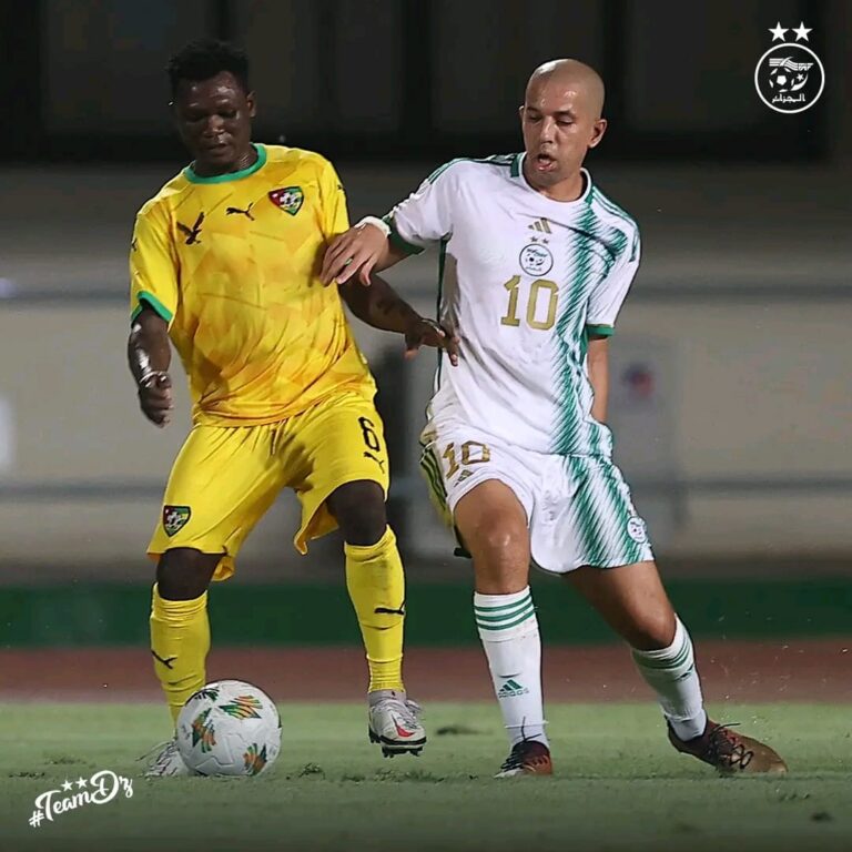 Sur un corner à la 20e minute, Idrissa Ogodjo apprécie mal la trajectoire du ballon, Rami Bensebaini en embuscade, catapulte le ballon de la tête dans les buts togolais pour l’ouverture du score des Algériens.