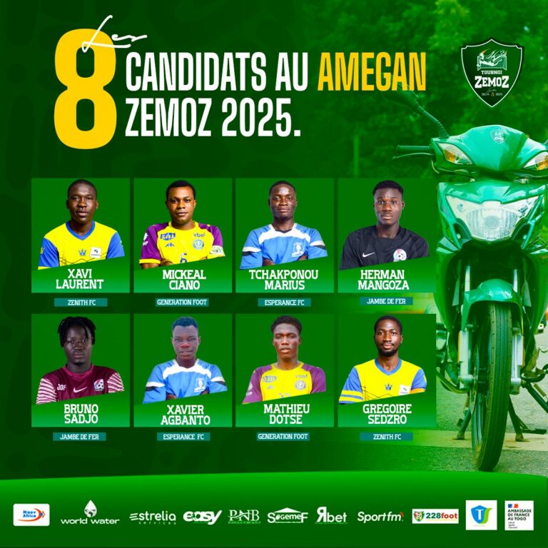 L’ambiance monte d’un cran dans le tournoi ZEMOZ 2025. Huit joueurs, huit talents bruts, huit figures montantes du football de petits poteaux viennent d’être révélés comme les finalistes du trophée AMEGAN, distinction suprême du meilleur joueur du tournoi. Ils nous viennent des clubs Zenith FC, Génération Foot, Espérance FC et Jambe de Fer, et chacun a laissé une empreinte forte sur cette édition.